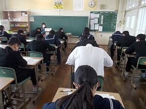 2月16日(水)・17日(木)に、本年度最後となる学年末テストが行われました。1・2年生は、国語、社会、数学、理科、英語、保体の6教科、3年生は、国語、社会、数学、理科、英語の5教科で実施されました。3年生にとっては、中学校最後のテストとなり、集中して取り組んでいました。結果が楽しみですね。