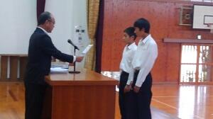 本日、11月4日(日)から始まる県中学校秋季大会に向けての推戴式が行われました。各部の選手が抱負を述べました。1勝でも多く勝ちたいや自己ベストが出るように走りたいといった抱負が聞けました。選手を代表して朝倉くんが力強い宣誓を、3年生天神原くんが自分の経験をもとにした励ましの言葉を述べてくれました。