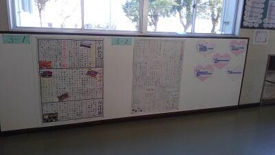 生徒玄関に各学級の壁新聞が文化委員会の手によって貼りだされました。学級ごとに内容を考え、工夫してつくられていました。たくさんの生徒が興味深く見いってました。明日は2年生・3年生の参観日、参観授業の前や修学旅行・進路説明会終了後などにぜひご覧ください。参観授業は13:15~です。よろしくお願いいたします。
