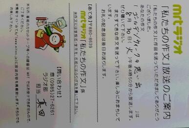 8月30日(火)の午後4時50分からの「MRTラジオ私たちの作文」で、3年生の木上介也くんの作文が放送される予定です。どうぞお聴きください。(T)