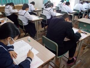 10月22日(金)に、各学年ごとに「英検IBAテスト」が実施されました。これは、宮崎県が、中学校の英語力の向上を目的に、日本英語検定協会と連携し、「英検IBAテスト」の受験及びオンライン学習などの活用を全県下で進めていくものです。試験時間は45分で、英検のリーディングとリスニングに関する検査が行われ、英検の資格は取得できませんが、英検の合格級のレベルを判定することができます。生徒は、真剣に取り組んでいました。
