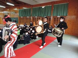 2月14日(木)3・4校時に職業講話がありました。講師は、都城市在住でプロのチンドン屋である宮田若奈さん(宮崎花ふぶき一座)夢をもつことの大切さについて、ご自身が経験されたことをもとに、明るく、楽しく、パフォーマンス&映像を交えながら話をしてくださいました。はじめて見るナマのチンドンに最初は戸惑っていた1年生も徐々に宮田さんに慣れてきたのか、後半は自然体で、笑顔で、そして真剣な顔で話を聞いていました。夢を本気で追いかける大人に触れ、生徒は大いに刺激を受けたようです。あっという間の2時間でした。宮田さんお忙しい中、本当にありがとうございました。