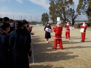 12月23日(水)の昼休みに、花吹雪一座と山之口町商工会青年部の皆様が来校され、マスクの贈呈と音楽のプレゼントがありました。山之口地区の子どもたちに元気を届けることを目的に、山之口町商工会と花吹雪一座がコラボ企画として実施していただきました。ありがとうございました。