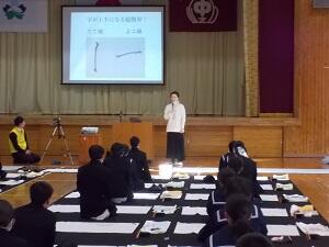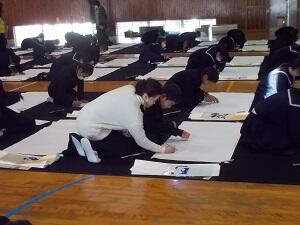 1月10日(金)の午後、1年生を対象に都城市が主催する「ラブレタープロジェクト」が、本校体育館で開催されました。このプロジェクトは、国内外で活躍されている芸術家であり都城市のロゴマークを製作された紫舟氏の指導のもと、大切な人へ大きな和紙に筆で手紙を書くものです。紫舟氏との交流を通して、プロの感性に触れ、PRロゴへの愛着を深め、ふるさと都城への愛郷心を育むことを目的開催されています。大きな和紙に筆で書くことが初めての生徒もおり、紫舟氏の説明を熱心に聞きながら練習し、一生懸命に取り組んでいました。