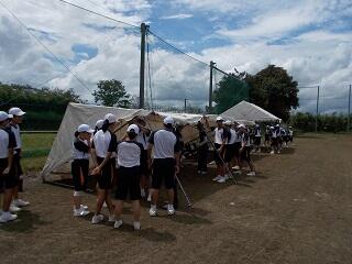 午後からは天候も回復し、日差しが戻ってきました。本部や来賓、団のテントの設置、机や椅子の搬入などを行いました。団看板やスローガンは、明日の朝に設置する予定です。準備終了後、昨日は雨のためにできなかった行進の確認と練習を行いました。最後に、明日の本番に向けて、両団長と実行委員長の話で終了しました。