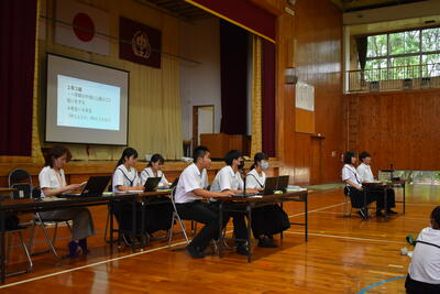 総会では、山之口中の新しい取組としての「小中学校の交流」と「校則の見直し」についてのニつの議題で、互いの意見を交わしました。