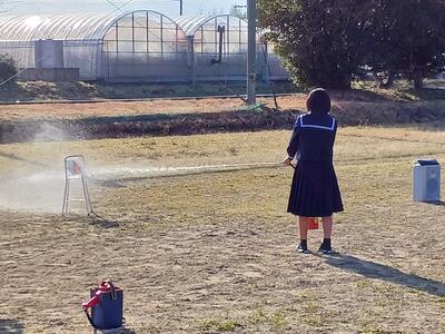 運動場へ避難したあと、消火器の使い方を教えていただきました。