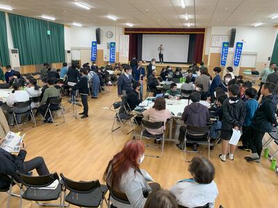 グループ別座談会の前半は、昨年度の活動までをまとめたプレゼンテーションを視聴し、小中学生が感じている地域や学校の良さや課題などを出し合いました。後半では、それらについて質疑応答を繰り返しながら山之口町の魅力を広く発信する方策について議論を深め、「空き家を宿泊施設として再活用するといいのではないか?」「弥五郎丼をブラッシュアップしながらアピールすればいいのではないか?」など前向きな意見が出されました。
