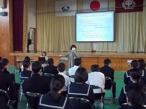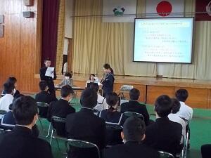 10月30日(金)の6校時に、3年生を対象として、デートDV防止講座が行われました。男女交際におけるデートDVの実態とその対処方法を理解し、よりよい人間関係を築くことができるよう実施されました。講師に、NPO法人ハートスペースMから、佐藤以津子さん、日髙チネ子さんをお招きして、「デートDVについて」と題して、講話をしていただきました。途中、ロールプレイングを交えながら分かりやすくお話しいただきました。ご来校いただき、ありがとうございました。
