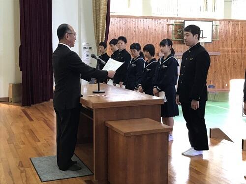 明日16日(土)は第72回卒業式です。保護者の皆様、地域の方々よろしくお願いいたします。今日15日(金)は卒業式の予行がありました。卒業生も在校生も姿勢よく卒業の歌も体育館に響きわたっていました。予行の後、3年間無欠席の生徒の表彰がありました。3年間一度も休まずに登校することは大変なことですが、9名もの生徒が無欠席達成していました。以下紹介します。
