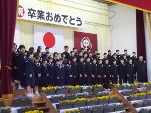 卒業式は、卒業証書授与、学校長式辞、記念品贈呈、卒業生代表のことば、校歌斉唱を行い、約30分で終了しました。その後、そのまま体育館で、約15分間の合同学活を行いました。始めに学級ごとに一人ずつ話をし、3年職員からの話、合唱を行い、下校となりました。