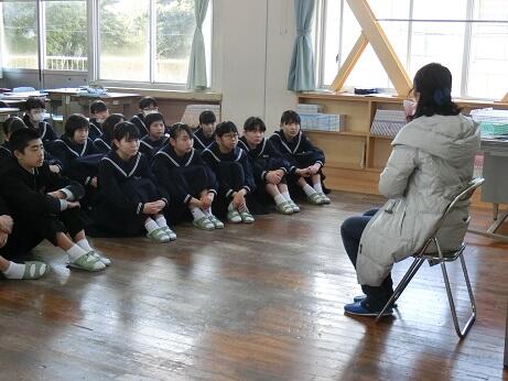 本校の保護者を中心に、6名の読書ボランティアの方々に協力してもらい、朝の時間に生徒達に読み聞かせを行っています。(T)
