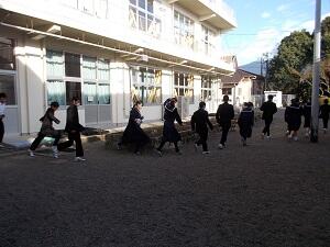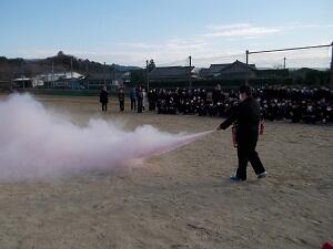 1月9日(木)6校時に、避難訓練(火災)を行いました。調理室から出火したとの想定で、運動場へ避難しました。その後、初期消火の訓練も行いました。株式会社ヤマトボーデンの方から、消火器の使用方法を説明していただき、各学年の代表生徒が実際に消火器で火を消す訓練をしました。