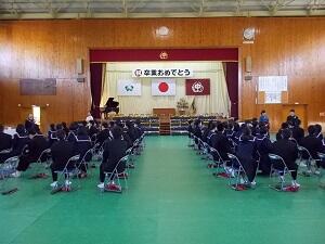 卒業式は、卒業証書授与、学校長式辞、記念品贈呈、卒業生代表のことば、校歌斉唱を行い、約30分で終了しました。その後、そのまま体育館で、約15分間の合同学活を行いました。始めに学級ごとに一人ずつ話をし、3年職員からの話、合唱を行い、下校となりました。