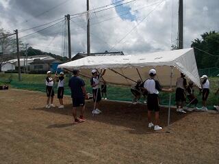 午後からは天候も回復し、日差しが戻ってきました。本部や来賓、団のテントの設置、机や椅子の搬入などを行いました。団看板やスローガンは、明日の朝に設置する予定です。準備終了後、昨日は雨のためにできなかった行進の確認と練習を行いました。最後に、明日の本番に向けて、両団長と実行委員長の話で終了しました。