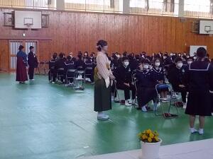卒業式は、卒業証書授与、学校長式辞、記念品贈呈、卒業生代表のことば、校歌斉唱を行い、約30分で終了しました。その後、そのまま体育館で、約15分間の合同学活を行いました。始めに学級ごとに一人ずつ話をし、3年職員からの話、合唱を行い、下校となりました。