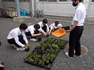 6月10日(木)総合的な学習の時間に、「花配り活動」の準備を行いました。地区別に集合し、お届けする方へのメッセージカード作成や担当者の確認、苗の移植作業などを行いました。