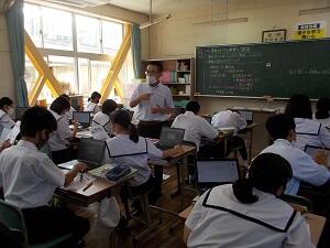 9月15日(水)の5校時に、研究授業を実施しました。校内研修の取組の一つで、平成30年度から、全ての先生方が年1回の研究授業を行っています。今回は、1年社会科、2年音楽科、3年理科・英語科の授業でした。本年度の研究の柱であるアウトプット及びICT活用が位置付けられた授業が展開されました。授業後のワークショップ型授業研究会も熱心に協議がなされました。