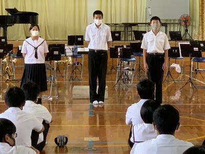7月13日(水)に、県中学校総合体育大会に出場する選手の推戴式と県吹奏楽コンクールに出場する吹奏楽部の演奏披露が行われました。
