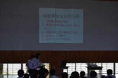 生徒会生活委員長と副委員長による自転車通学のルールやヘルメットの正しい着用、自転車置き場での留め方など説明があった後、学校周辺の危険箇所の確認とヘルメット着用の大切さについてのVTRを見ました。