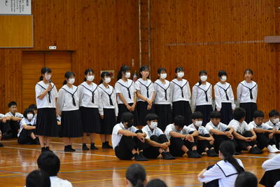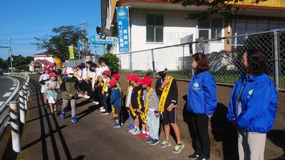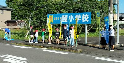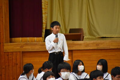 3年生と2年1組の生徒が出身小学校へ行き、小学生やまちづくり協議会の方たちと一緒に元気にあいさつを行いました。