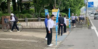 また、中学校の正門では、生徒会とまちづくり協議会の方たちとであいさつを行いました。