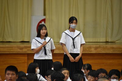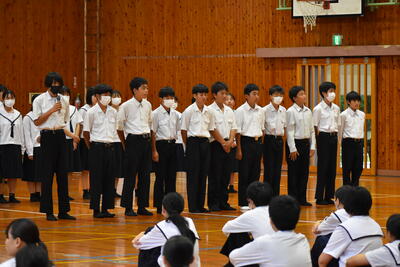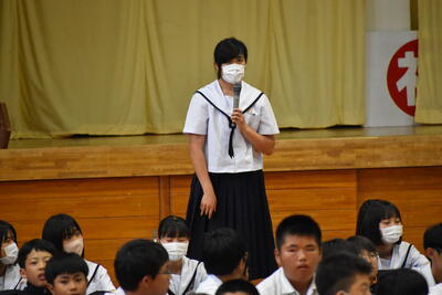 5月27日(月)に地区中学校総合体育大会の推戴式を行いました。各部のキャプテンが抱負を発表しました。