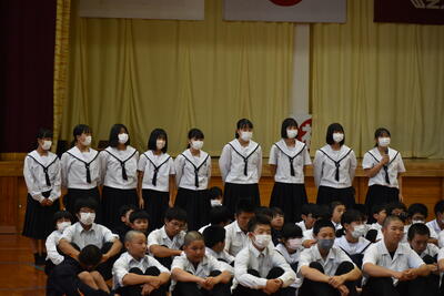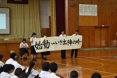 今年度の生徒会スローガンは「始動 ~いざ出陣の時~」で、「今まで引き継いだ伝統をさらに発展させ、新しいことを始める」という意味が込められています。