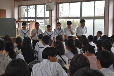 ↑ 新生徒会役員が紹介され、新生徒会長があいさつを行いました。