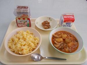 本日の給食は、クリスマス献立(キャロットピラフ、野菜のミートソース煮込み、照り焼きチキン、クリスマスケーキ、牛乳)でした。