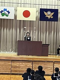 まず始めに、冬休み中に活躍した吹奏楽部と男子ソフトテニス部の表彰、数学や英語、漢字の検定合格者の表彰がありました。その後4人の生徒代表のことば、校長先生の話がありました。