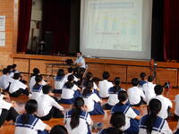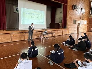 講師に都城警察署の笠牟田様をお招きし、交通ルールやマナーについて詳しく話していただきました。特に、自転車の「一時停止」「止まれ」に気を付けることで、多くの事故を防ぐことに繋がるということを何度も強調されていました。命を守るための貴重な話をありがとうございました。