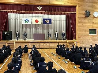 まず始めに、冬休み中に活躍した吹奏楽部と男子ソフトテニス部の表彰、数学や英語、漢字の検定合格者の表彰がありました。その後4人の生徒代表のことば、校長先生の話がありました。