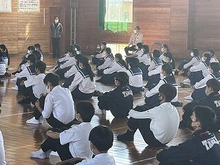 27日(金)に、来年度入学予定の高城小学校、石山小学校、有水小学校の各6年生が本校体育館に集合して、新入生入学説明会が行われました。