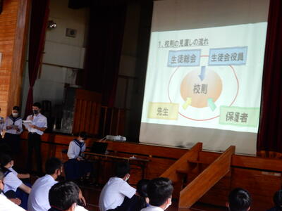 校則についてと生徒会役員が作成したSDGsのプレゼンテーションを堂々と発表してくれました。今後の活躍も楽しみです。