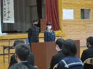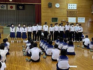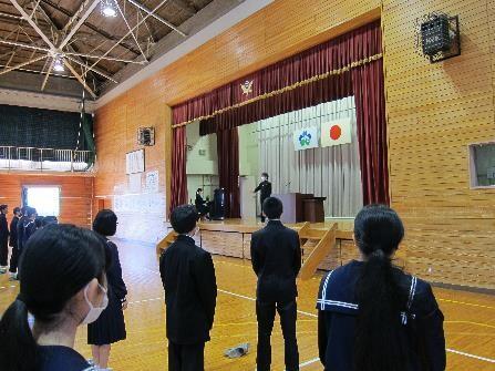 11月18日(水)は、10月末に行った生徒会役員選挙で当選を果たした新生徒会役員や全校専門正副委員長の任命や新旧役員の交代式を行いました。第74代()生徒会はコロナ禍で臨時休業があったり、活動が制限されたりしましたが、めげることなくできることを着実に活動を行なってくれました。感謝しています。これまでお疲れさまでした。第75代()生徒会もその強い意志を受け継ぎ、素晴らしい活躍を期待します。
