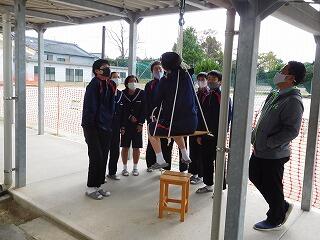 渡り廊下で行われた理科の大がかりな滑車の実験が人気です。