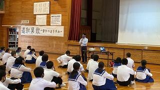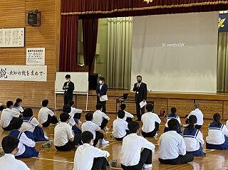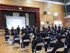 2年生は、2月12日()に立志式を行いました。これまでの自分を振り返り、これからの自分の生き方について考えたことを「立志の誓い」として、全体の前で発表しました。改まった場で、緊張しながらも堂々とした態度にこれまでの成長を感じることができました。また、BTV株式会社の有満祐太朗様から「夢へのアイテム」と題して、記念講演をしていただきました。この集いが、中学校最高学年へ進級することを自覚し、自分をさらに高めていこうとするきっかけになってくれることを望みます。