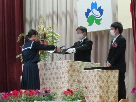 3月26日(金)は、3学期の終業日でした。1・2年生は令和2年度の課程を修了し、校長先生から「修了証」を授与されました。生徒代表のことばとして、1年生代表は普段の授業をしっかりと受け、先輩としての自覚を持つ。2年生代表は当たり前の生活に感謝し、志望高校合格を目指して予習・復習に力を入れる。生徒会代表はコロナ禍でも、進んで意思を伝え合いみんなとの絆を深めたいと、述べてくれました。校長先生は、生徒のみなさんが無事に令和2年度を終えられたことを喜ばれ、これからも「やらない後悔よりやった後悔」選び、果敢に挑戦し成長してほしいと話されました。