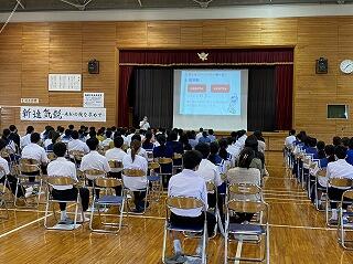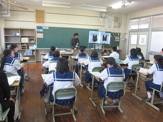 2年生は、例年であれば地域の事業所で職場体験学習を行っているところですが、今年度は新型コロナウィルス感染症対策のため体験学習は見合わせることになりました。そこで、11月6日(金)は、キャリア教育として8つの企業の方々に職業講話を行っていただきました。企業の事業内容を映像や実際の商品などで分かりやすく説明していただきました。
