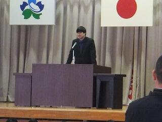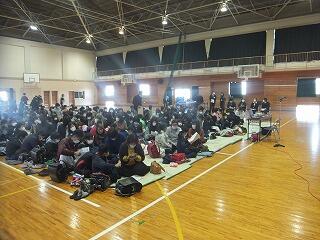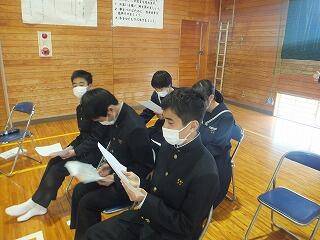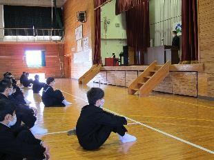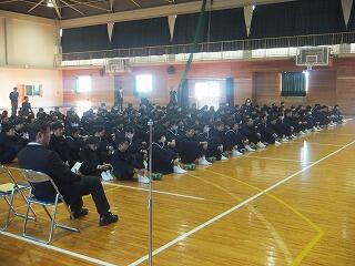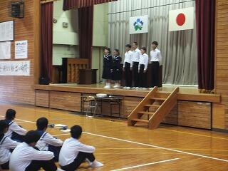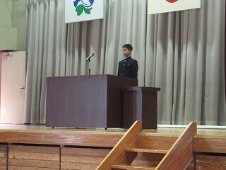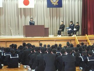 1月17日(金)は、体育館で生徒集会を行いました。はじめに女子ソフトテニス部の女子1ペアが地区対抗予選大会で3位入賞を果たし、表彰されました。次に、生徒全員で高城中生未来宣言を朗読し、生徒会役員、専門委員会正副委員長が今年1年間の活動について抱負を述べました。各種行事のリーダーとなり、生徒会員の力をまとめ、高城中の伝統を築いていってくれることを約束してくれました。そのあとは、高校入試が迫ってきている3年生に、1・2年生全員でエールを送りました。3年生が自分の力を十分発揮して、合格してくれることをみんなで応援しています。