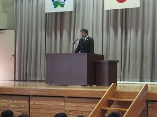 各学年代表と生徒会役員代表による2学期の反省等がありました。その後、校長先生がパソコンの画面を使って話をされました。有意義な冬休みを過ごしてください。