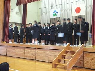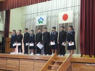 3学期の始業式後に、生徒会役員交代式を行いました。旧役員のみなさん、お疲れさまでした。新役員のみんさん、頑張ってください。