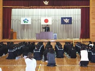 校長先生や養護教諭からの話があり、その後、九州大会に出場する「男子ソフトテニス部」・「吹奏楽部」の激励式を行いました。