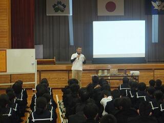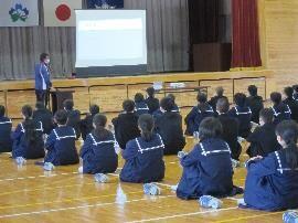 11月28日(木)は、体育館で薬物乱用防止教室を行いました。始めにデンサンの方に情報モラルについて気をつけることを話してもらいました。次に、都城警察署生活安全課の方に薬物のことについて説明をしていただきました。中学生といえども、どちらのことも身近な問題であることを認識しておかなければなりません。これからの生活の中で、誘われてもきっぱりと断ることが大切であることを学びました。また、その場から立ち去ることも、自分の身を守る行動であることを学びました。今回の学習が、皆さんの人生に、よりよく生かされることを願っています。