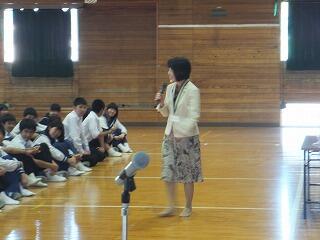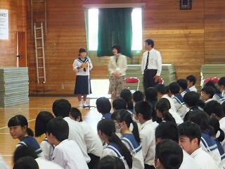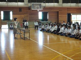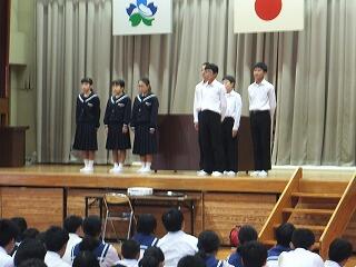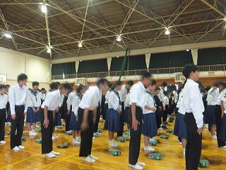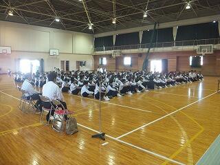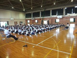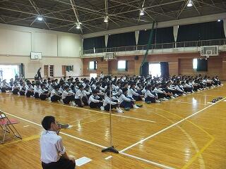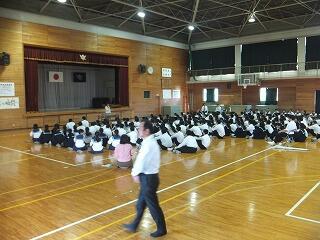 1日は、夏休みに入って最初の登校日でした。朝の会や清掃をしたあと、全校集会を行いました。まず、はじめは県中総体で3位入賞を果たした女子ソフトテニス個人ペアの表彰を行いました。そして、その2名が九州大会に出場することやオーストラリアに派遣される生徒のことなどを校長先生が紹介されました。その他にも、地区で行われる行事やボランティア活動に進んで参加し、それぞれが成長できる夏休みにしてくれることを期待していると話されました。また、生徒指導主事の先生が、あらためて夏休みの過ごし方で気をつけることを3つ話されました。1つ目は規則正しい生活を送り健康に過ごすこと。2つ目は水や交通事故に気をつけること。3つ目はSNSを介したトラブルが多くなることを踏まえ、相手の気持ちを考えるということでした。以上の話しを忘れず、残りの夏休みが有意義に過ごしてください。