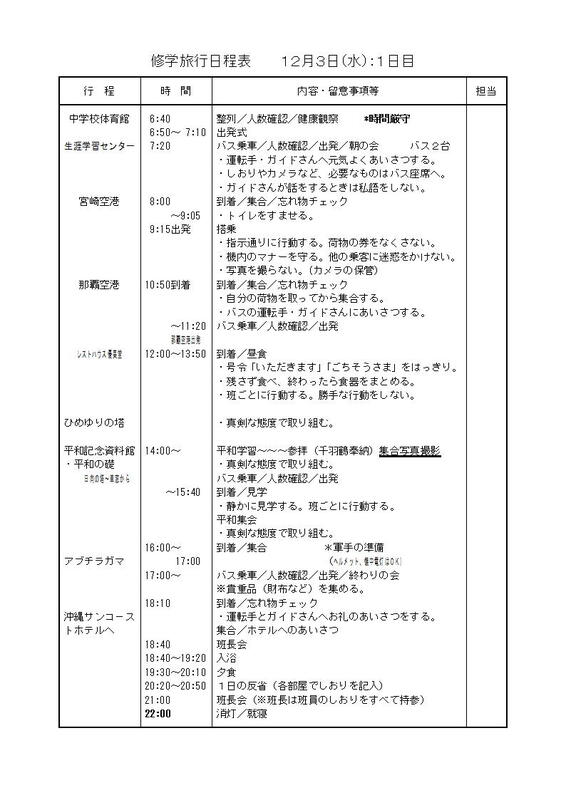 第2学年の中でも最大の行事である修学旅行がやってきました。5月にあった遠足や、文化祭などで戦争や平和について学習してきました。今回の修学旅行で、これまでの平和学習を生かし沖縄で学んできましょう。みんなが一つになって全員で一生の思い出に残るものにしましょう。みんなで楽しい修学旅行を作り上げましょう。