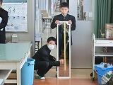 今年も、1年生7名、2年生8名が立候補。選挙管理委員会は3年生です。記載台、投票箱も本物を使用します。今年は、市選挙管理委員会から出前授業の機会を得まして、若者の投票率の低い現状と、投票することの意義、大切さについて学習しました。また、投票用紙の自動計算機や、折ってもすぐに開く仕組みをもつ本物の投票用紙の体験コーナーも作っていただき、貴重な学習の機会となりました。