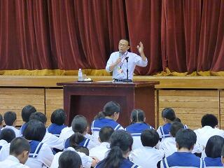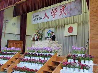 「今日ここに、中学生として入学できることを、たくさんの周囲の方、おうちの方に感謝してください。まず、生まれてきたことに感謝です。お母さんは命がけで皆さんを産んでくださいました。産もうと決心されたのです。小さい時、病気やけがをすると、夜中でも必死に病院を訪れたことでしょう。お父さんお母さんをはじめ、たくさんの人に支えられてここまでたどりつきました。感謝の気持ちを大切にし、謙虚で素直な中学生として、大いに伸びてほしいと思います。」