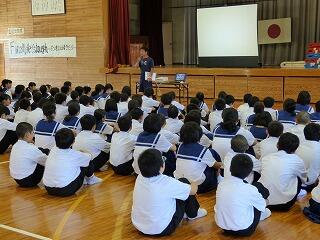 1学期から、総合的な学習の時間に高城のことを学習してきました。その一環として、高城郷土歴史館(日和城)で行われる企画展へ参加し、副館長さんから講話をしていただきました。講話の内容は、『高城の歴史と文化』です。この都城一帯は大昔は湖で、たまっていた水が流れ出たところが高城にある観音瀬であったことや、高城は恵まれた土地で奪い合いの戦争が起こっていたことなど勉強になる話を聞きました。講話を聞いた後は、資料館内の展示品を見て回りました。